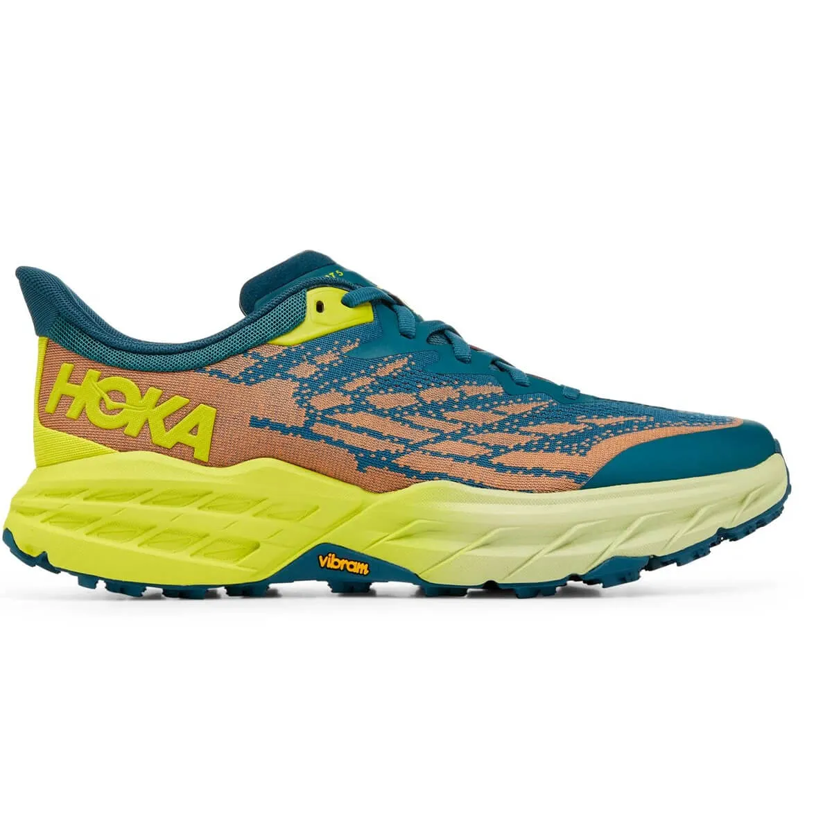 The men's Hoka Speedgoat 5 is described by Hoka One One as: "A workhorse designed for technical trails, the Speedgoat returns as a new shoe from outsole to laces. This trail beast is updated with Vibram® Megagrip with Traction Lug for upgraded grip and braking power on loose soil. A whole 15 grams lighter, the much grippier fifth Speedgoat edition features many enhancements to improve performance. Weight reduction also comes from fewer overlays – helping us work towards a more sustainable construction.
