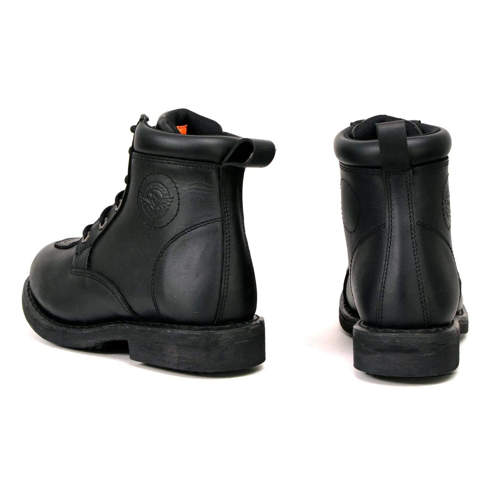 - Lace Up and Side Zipper Closure | | These motorcycle shoes for women feature a classic front lace-up design closure that allows you to easily put them on and take them off. The women's riding boots have double layer leather on the upper for gear shifting protections, as well as a Milwaukee leather metal plate on the front laces to complete the biker boots' look.