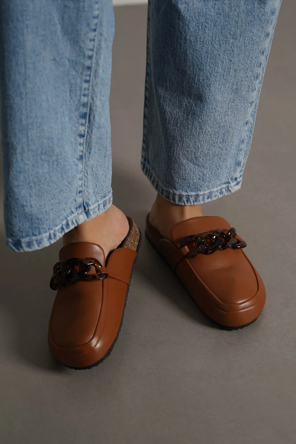 Design detail: Fun chain mules with cork detail midsole and lightweight outsole.